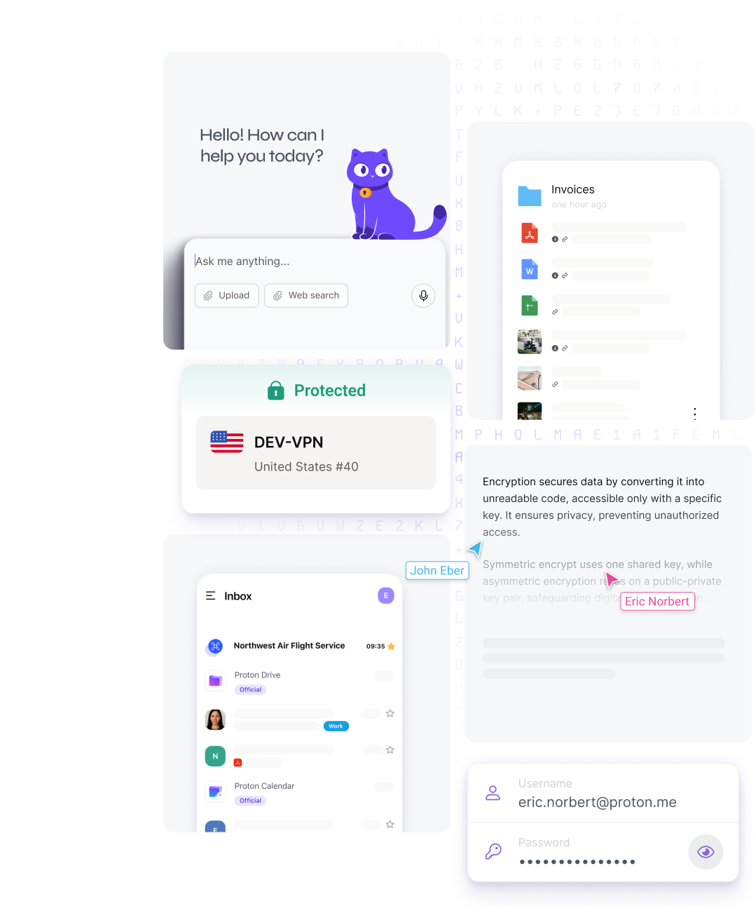 Proton security starts with end-to-end encryption. Nobody — not even Proton — can see your emails, calendar events, files, and other data stored on our servers.