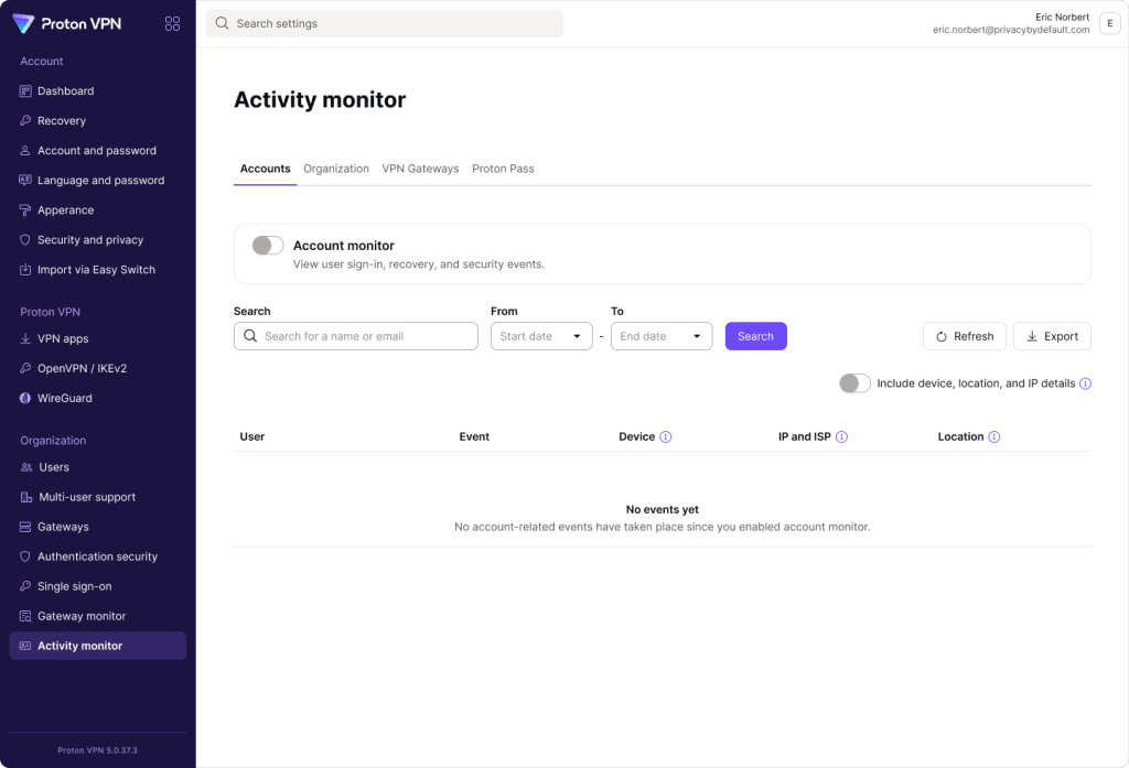 - Account monitor: Shows authentication, sign-in, and account management events. Available with Proton Business Suite and all Proton for Business plans at the Professional tier.